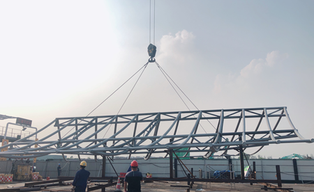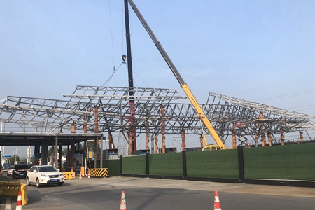 收費(fèi)大棚造型約2000平方米,鋼結(jié)構(gòu)主體桁架總重約為109噸,分五榀吊裝施工,首榀從8月27日開始吊裝,經(jīng)過十多天的不間斷施工,9月8日鋼結(jié)構(gòu)主體工程完工。
