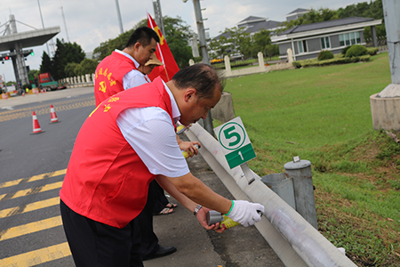 活動中,黨員們個個干勁十足,不怕曬,不怕臟,不怕累,帶著火夾、袋子、噴漆等工具認真而又耐心地清理了外廣場護欄上的紅漆小廣告,又把廣場護欄邊的煙頭、紙巾、塑料袋、紙屑等白色垃圾一一撿起裝進垃圾袋。清理活動完成后,黨員們協(xié)助高速交警進行入口管控并將中分帶的水馬和隔離護欄排列整齊,確保收費站車輛通行安全暢通。